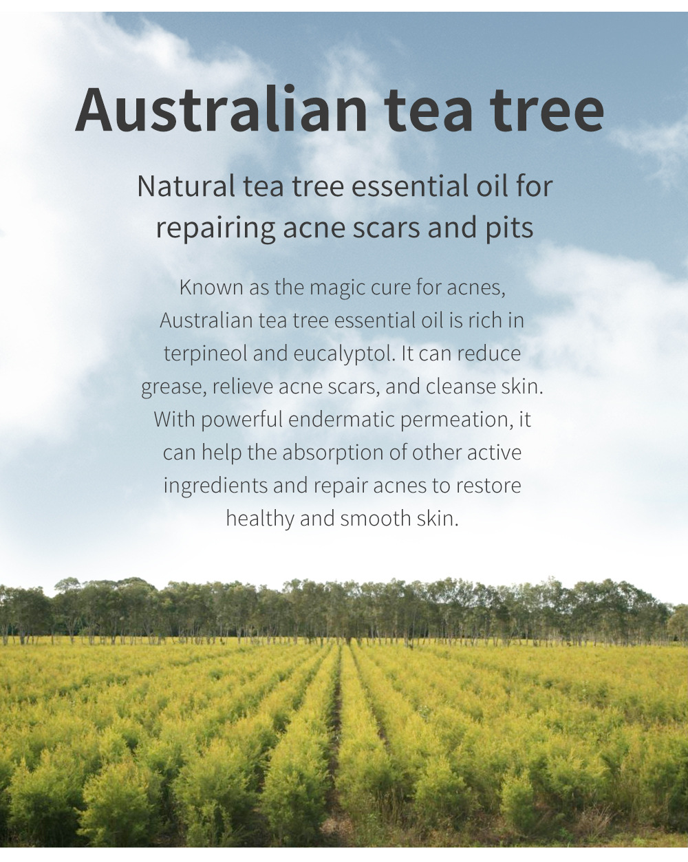 The essential oil of the Australian tea tree is rich in terpineol and eucalyptol. It can reduce grease, relieve acne scars and cleanse the skin.